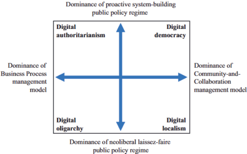 A partir de estas dimensiones, y ante la situación actual de cambio, los citados autores identificaron cuatro escenarios para la trayectoria futura de la transformación digital que podrían definir su futuro. Estos surgieron de la combinación de dos factores clave: el modelo de gestión dominante (Business Process vs. Community-and-Collaboration) y el tipo de régimen de política pública (neoliberal vs. sistema proactivo). A partir de esta combinación, los autores identifican los siguientes cuatro posibles futuros: autoritarismo digital, oligarquía digital, localismo y democracia digital, representados en la Figura 1.