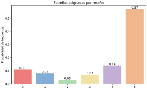 El análisis de las calificaciones otorgadas mediante estrellas (Figura 1) revela una distribución desigual, con una notable predominancia de la puntuación máxima: el 57 % de las reseñas asignan la calificación de cinco estrellas, lo que representa una mayoría frente a las demás categorías. Una distribución normal tendría más reseñas en la gama media (tres y cuatro estrellas) y una menor proporción en los extremos. Adicionalmente, el 11 % de las personas que escribieron comentarios cualitativos no asignaron una calificación en cuanto al número de estrellas (valor 0).