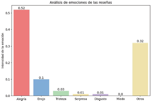 La intensidad de las emociones identificadas en el corpus de reseñas de Google Maps sobre restaurantes de gastronomía poblana (Figura 2) muestra que la alegría (0.52) es la emoción con mayor intensidad promedio, seguida por la categoría “Otros” (0.32). Este último hallazgo sugiere que aproximadamente un tercio de las reseñas expresan matices emocionales no contemplados en las categorías primarias definidas. En contraste, las emociones negativas como el enojo (0.10), la tristeza (0.03), la sorpresa (0.01) y el disgusto (0.01) presentan intensidades considerablemente menores. El miedo (0.00) se manifiesta como una emoción prácticamente ausente en el conjunto de datos analizado.