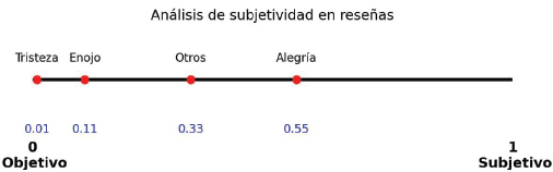 El análisis de subjetividad por emoción (Figura 5) evidencia que las emociones de enojo y tristeza presentan un nivel más alto de objetividad, mientras que la alegría se sitúa en un punto intermedio entre subjetividad y objetividad. Con base en esto, es posible afirmar que las emociones negativas tienen un nivel más alto de objetividad que las emociones positivas.