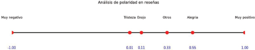 En cuanto a la polaridad, si bien las emociones de enojo y tristeza tienden a ubicarse en un nivel neutro, la alegría exhibe una polaridad marcadamente positiva (Figura 6). Esto sugiere que las reseñas con una carga emocional de alegría expresan juicios de valor más extremos que aquellas impregnadas de tristeza o enojo.